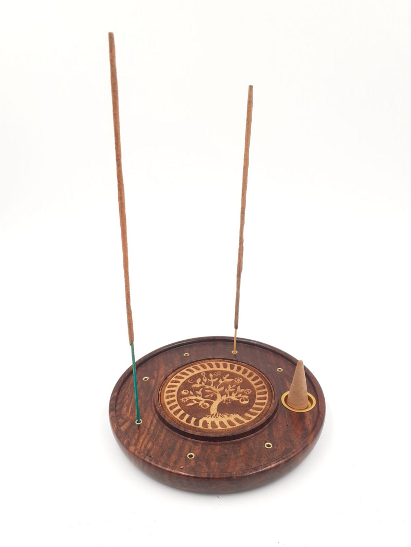 Bruciaincenso legno con inserti ottone albero della vita per sticks e conetti, provenienza India