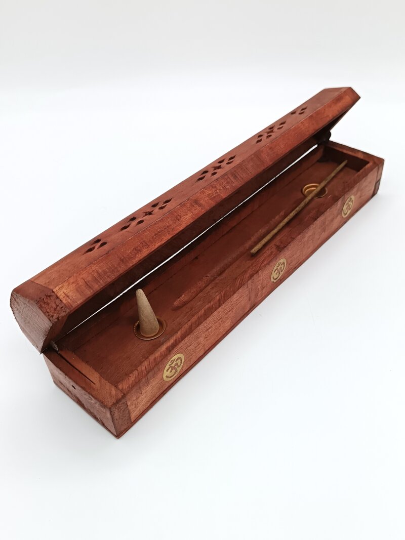 Bruciaincenso legno a scatolina con applicazioni in ottone del simbolo OM, adatto per bruciare sticks e conetti.