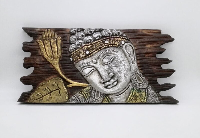 Pannello decorativo volto Buddha in legno marrone, argento e oro da appendere.