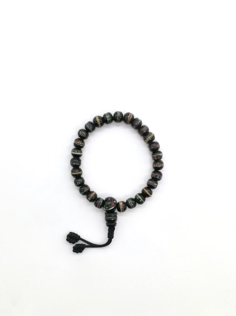 Mala da polso in resina nera con inserti in metallo e frammenti pietra, regolabile composta da 27 grani di diametro 8mm ca.