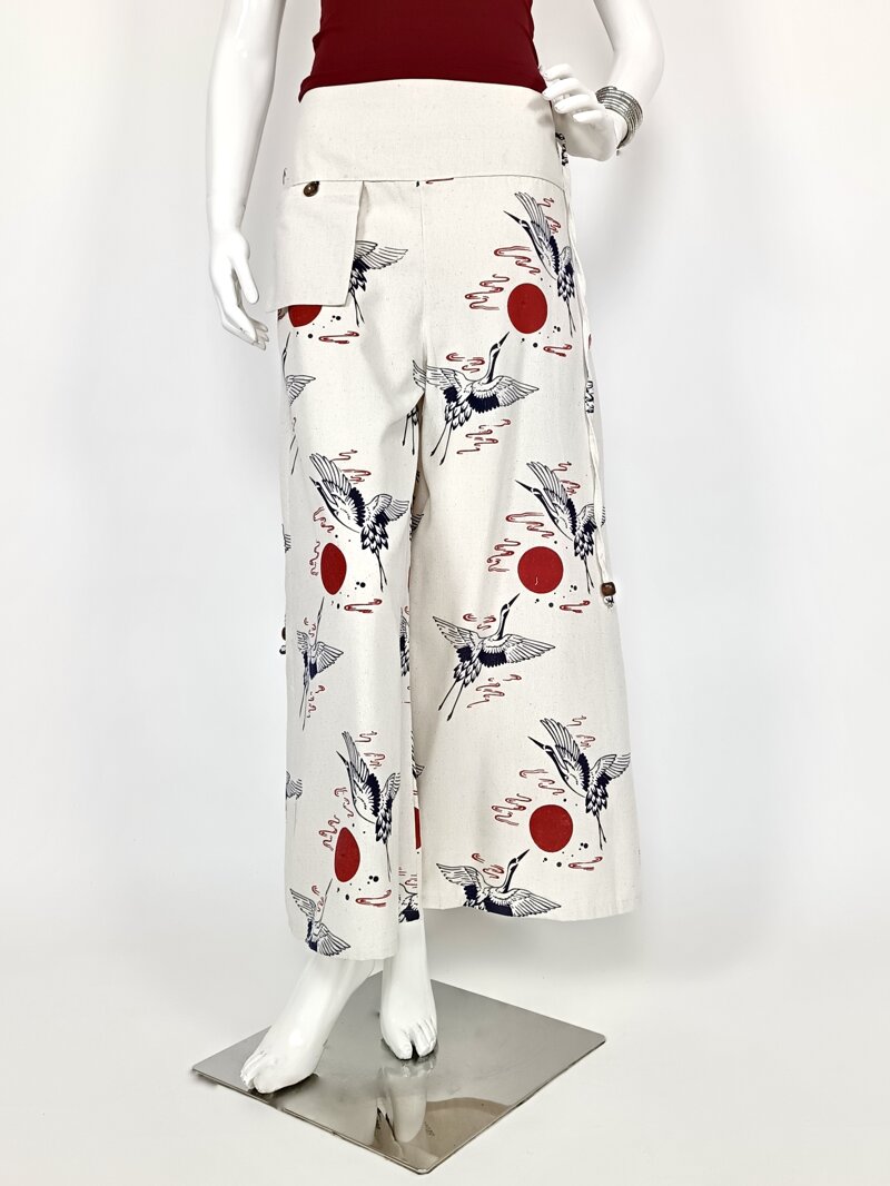 Pantalone cotone svasato con tasca e laccetti motivo aironi.